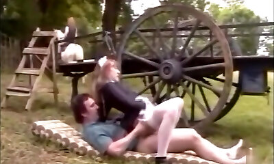 French maid in pantyhose nails on a farm with huge cumshot