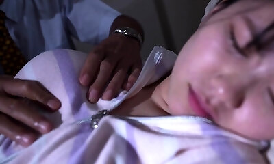 Pervert is fapping off his cock sitting next to sleeping sis Angelica Cruz