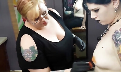 gorgeous tattooed redhead proudly shows pierced bra-stuffers