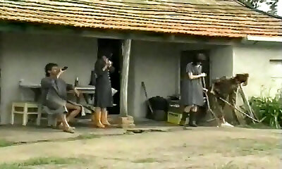 Sexy and cute village girls in the barn having foursome