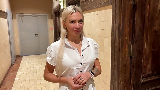 Hot and dangerous blowjob in the toilet of the shopping center from a Russian saleswoman.
