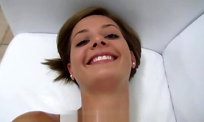 Lucky dude talked a brunette sweetie into playing with his dick