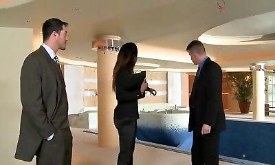 Cute brunette tart gets double teamed by two men