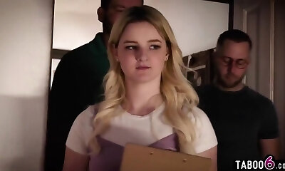 Playful sandy-haired stepsister properly DPed by two horny bulls in loud trio