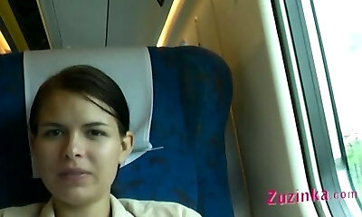 Shameless bitch Zuzinka flashes her shaved cooter in the train